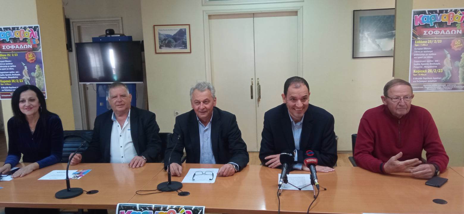 Όλα είναι έτοιμα για το 40ο Καρναβάλι Σοφάδων , το οποίο “επανέρχεται” δυναμικά μετά από την πανδημία. Σήμερα παραχωρήθηκε συνέντευξη τύπου στα γραφεία της Περιφερειακής Ενότητας Καρδίτσας, από τους εκπροσώπους των διοργανωτών και συγκεκριμένα, από τον αντιπεριφερειάρχη κ. Νούσιο, το δήμαρχο Σοφάδων κ. Σκάρλο, την πρόεδρο του Μορφωτικού Συλλόγου Σοφάδων κ. Σταθοπούλου, τον δημοτικό σύμβουλο Σοφάδων κ. Κουτσομηλιά, παρουσία του θεματικού περιφερειάρχη κ. Αναγνωστόπουλου.