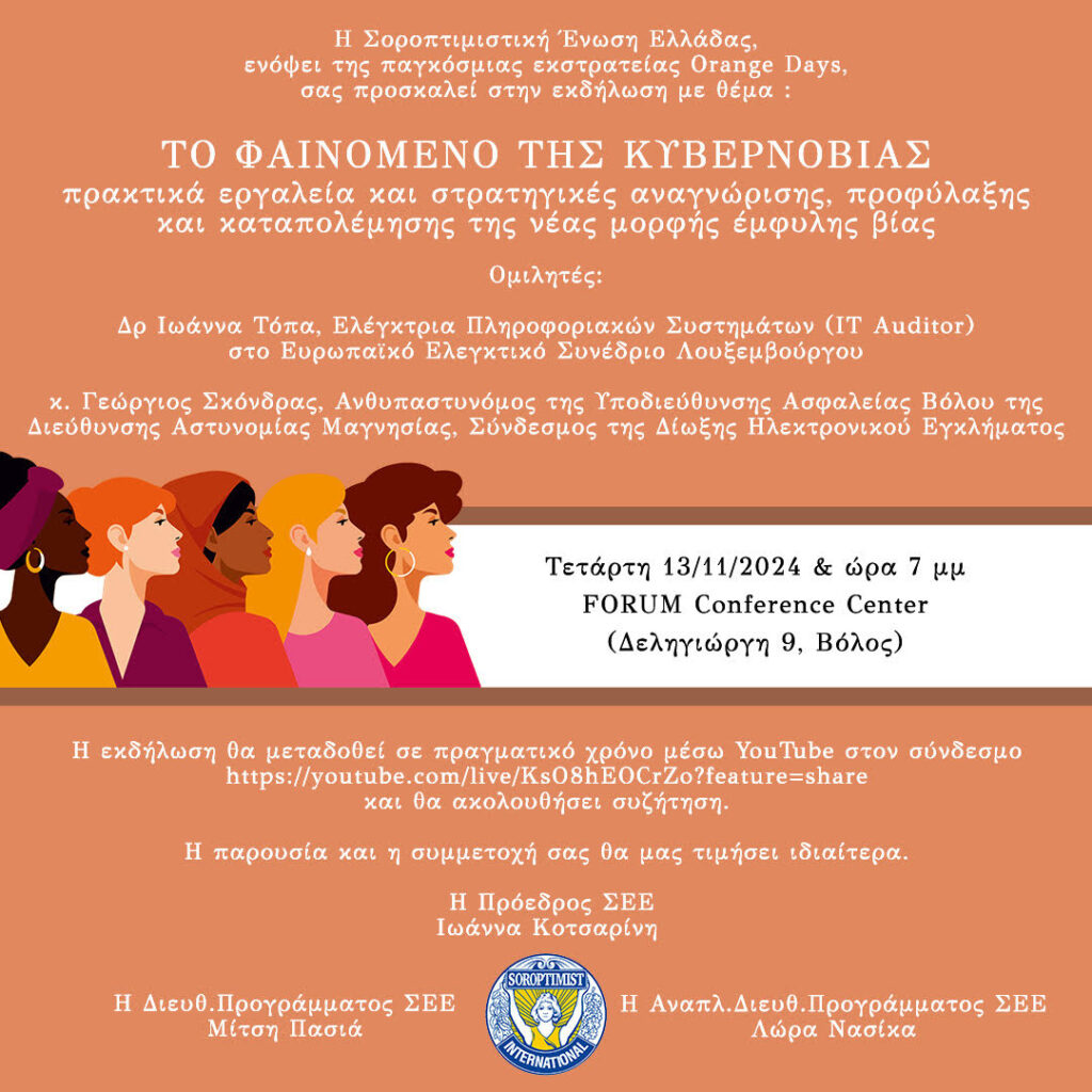 Στο Βόλο θα πραγματοποιηθεί η εκδήλωση της Σοροπτιμιστικής Ένωσης Ελλάδας στο πλαίσιο της παγκόσμιας εκστρατείας “Orange Days» για την εξάλειψη της βίας κατά των γυναικών. Η εκδήλωση με τίτλο «Το φαινόμενο της Κυβερνοφοβίας» – πρακτικά εργαλεία και στρατηγικές αναγνώρισης, προφύλαξης και καταπολέμησης της νέας μορφής έμφυλης βίας που θα πραγματοποιηθεί στο Βόλο, την Τετάρτη 13 Νοεμβρίου 2024 στις 7 το απόγευμα στο “Forum Conference Centerr” (Δεληγιώργη 9) περιλαμβάνει ομιλίες από τους : Δρ Ιωάννα Τόπα, Eλέγκτρια Πληροφοριακών Συστημάτων στο Ευρωπαϊκό Ελεγκτικό Συνέδριο Λουξεμβούργου και Γεώργιο Σκόνδρας, Ανθυπαστυνόμο της Υποδιεύθυνσης Ασφαλείας Βόλου της Διεύθυνσης Αστυνομίας Μαγνησίας, Σύνδεσμο της Διώξεως Ηλεκτρονικού Εγκλήματος. Θα ακολουθήσει συζήτηση και οι ομιλητές θα απαντήσουν σε ερωτήσεις του κοινού.